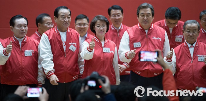 (서울=포커스뉴스) 28일 오후 서울 여의도 국회 의원회관에서 열린 새누리당 20대 총선 공천자대회에 참석한 이인선 대구 수성을 후보와 공동선대위원장들이 기념촬영을 하고 있다. 왼쪽부터 이인제, 서청원, 이 후보, 김무성, 강봉균 선대위원장.