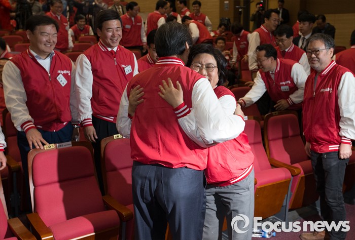 (서울=포커스뉴스) 28일 오후 서울 여의도 국회 의원회관에서 열린 새누리당 20대 총선 공천자대회에 참석한 김무성(왼쪽) 공동선대위원장과 이혜훈 서울 서초갑 후보가 포옹을 하고 있다.