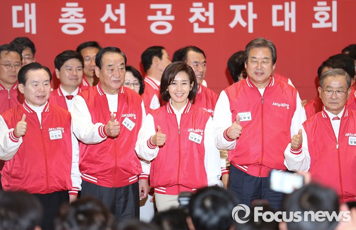 (서울=포커스뉴스) 28일 오후 서울 여의도 국회 의원회관에서 열린 새누리당 20대 총선 공천자대회에 참석한 나경원 서울 동작을 후보와 공동선대위원장이 기념촬영을 하고 있다. 오른쪽부터 강봉균, 김무성 위원장, 나 후보, 서청원, 이인제 위원장.