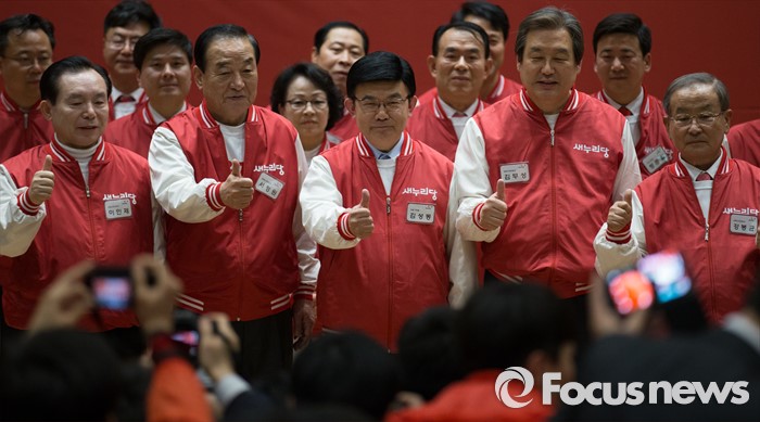 (서울=포커스뉴스) 28일 오후 서울 여의도 국회 의원회관에서 열린 새누리당 20대 총선 공천자대회에 참석한 김성동 서울 마포을 후보와 공동선대위원장이 기념촬영을 하고 있다. 오른쪽부터 강봉균, 김무성 위원장, 김 후보, 서청원, 이인제 위원장.