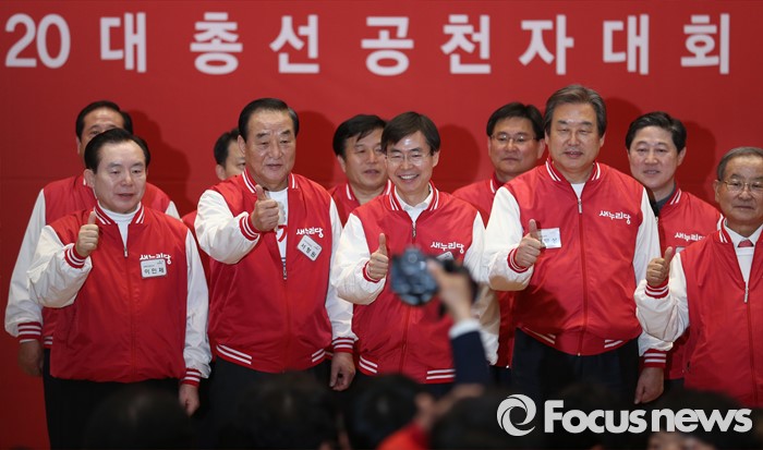 (서울=포커스뉴스) 28일 오후 서울 여의도 국회 의원회관에서 열린 새누리당 20대 총선 공천자대회에 참석한 조경태 부산 사하을 후보와 공동선대위원장이 기념촬영을 하고 있다. 오른쪽부터 강봉균, 김무선 위원장, 조 후보, 서청원, 이인제 위원장.