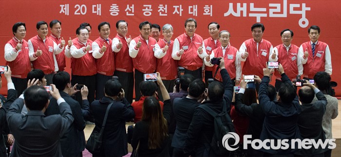 (서울=포커스뉴스) 28일 오후 서울 여의도 국회 의원회관에서 열린 새누리당 20대 총선 공천자대회에 참석한 지도부와 경남 지역 후보들이 기념촬영을 하고 있다.