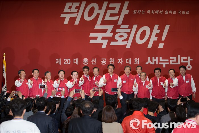 (서울=포커스뉴스) 28일 오후 서울 여의도 국회 의원회관에서 열린 새누리당 20대 총선 공천자대회에 참석한 대전 및 충남 지역 후보들과 지도부가 기념촬영을 하고 있다.