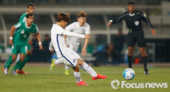 (고양=포커스뉴스) 28일 오후 경기 고양종합운동장에서 열린 올림픽축구대표팀 2차 평가전 대한민국과 알제리의 경기에서 한국 문창진이 후반전 패널트킥으로 팀 세번째 골을 넣고 있다.