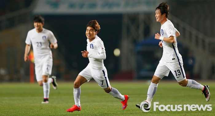 (고양=포커스뉴스) 28일 오후 경기 고양종합운동장에서 열린 올림픽축구대표팀 2차 평가전 대한민국과 알제리의 경기에서 한국 문창진이 후반전 추가골을 넣고 세리머니를 하고 있다.