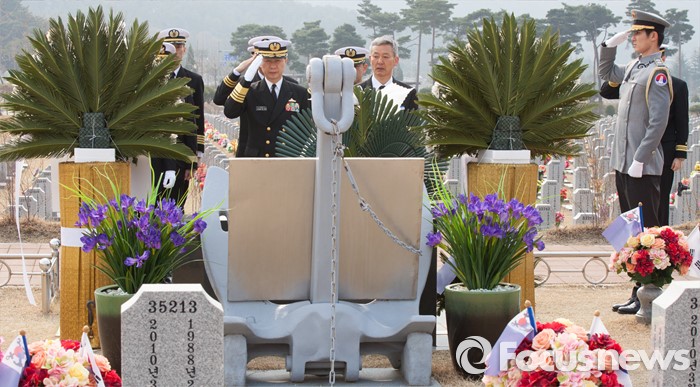 (대전=포커스뉴스) 다케이 도모히사 일본 해상막료장(해군참모총장)이 29일 오전 대전 유성구 국립대전현충원을 방문, 천안함 46용사 묘역을 찾아 거수경례하고 있다.