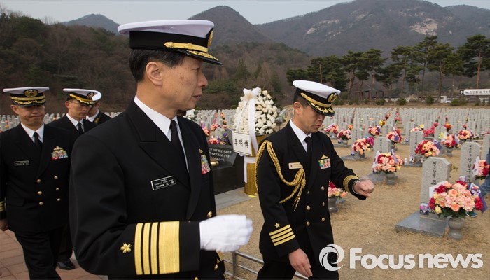 (대전=포커스뉴스) 다케이 도모히사 일본 해상막료장(해군참모총장)이 29일 오전 대전 유성구 국립대전현충원을 방문, 천안함 46용사 묘역을 둘러보고 이동하고 있다.