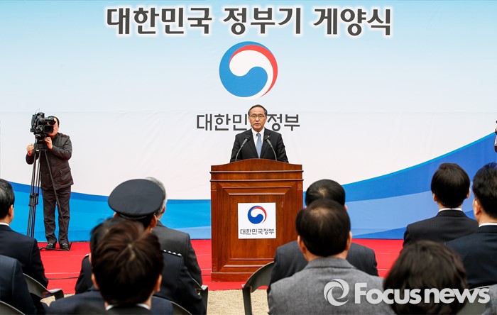 (서울=포커스뉴스) 29일 오전 서울 종로구 정부서울청사에서 대한민국 정부기 게양식이 열렸다. 이날 행사에 참석한 홍윤식 행정자치부 장관이 인사말을 하고 있다. 정부는 67년간 사용해온 '무궁화'에서 '태극' 도안으로 바뀐 새 정부기를 정부세종청사와 서울청사 등 10개 청사에 게양했다.