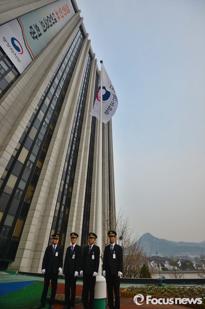 (서울=포커스뉴스) 29일 오전 서울 종로구 정부서울청사에서 대한민국 정부기 게양식이 열렸다. 이날 행사에 참석한 정부 관계자들이 새 태극 도안 정부기를 게양하고 있다. 정부는 67년간 사용해온 '무궁화'에서 '태극' 도안으로 바뀐 새 정부기를 정부세종청사와 서울청사 등 10개 청사에 게양했다.