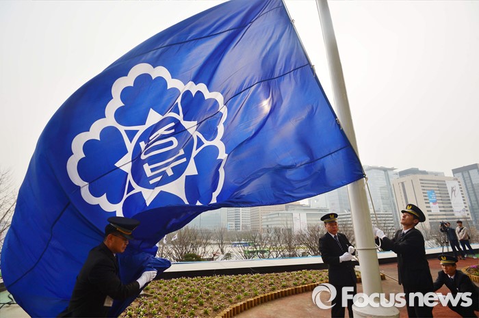 (서울=포커스뉴스) 29일 오전 서울 종로구 정부서울청사에서 대한민국 정부기 게양식이 열렸다. 이날 행사에 참석한 정부 관계자들이 기존 무궁화 도안 정부기를 내리고 있다. 정부는 67년간 사용해온 '무궁화'에서 '태극' 도안으로 바뀐 새 정부기를 정부세종청사와 서울청사 등 10개 청사에 게양했다.
