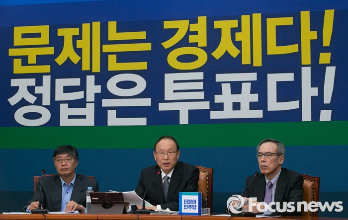 (서울=포커스뉴스) 최운열(가운데) 더불어민주당 선대위 국민경제상황실장이 29일 오전 서울 여의도 국회에서 국민경제상황실 운영 취지 및 당 경제공약과 관련 기자회견을 하고 있다.