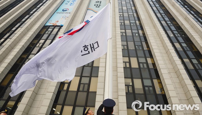 (서울=포커스뉴스) 29일 오전 서울 종로구 정부서울청사에서 대한민국 정부기 게양식이 열렸다. 이날 행사에 참석한 정부 관계자들이 새 태극 도안 정부기를 게양하고 있다. 정부는 67년간 사용해온 '무궁화'에서 '태극' 도안으로 바뀐 새 정부기를 정부세종청사와 서울청사 등 10개 청사에 게양했다.