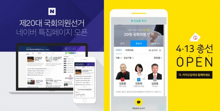 네이버도 총선 후보자 등록이 25일 마감됨에 따라 네이버 검색에서 후보자 검색 서비스를 제공한다. 유권자들은 선거구별 후보자 프로필과 공약, 지지율 등 출마 후보에 대한 정보를 구체적으로 살펴볼 수 있다. 앞서 네이버는 지난 '제20대 국회의원 선거' 특집 페이지를 오픈한 바 있다, 총선 특집 페이지는 선거 당일까지 총선과 관련한 뉴스, 여론조사 등을 종합적으로 전달하는 한편, △투표안내 등 선거 정보 △후보자 토론회 △실시간 투표율 △출구조사 결과 △개표 현황 등을 차례로 다룰 예정이다.