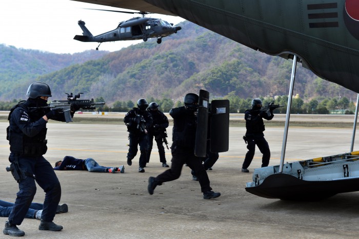 당시 공군에서는 제1전투비행단 대테러 초동조치 요원이 즉각 출동해 테러 대비태세를 갖췄으며, 폭발물처리반 요원들과 탐지견을 동반한 군견소대 요원들이 현장 수색작전을 펼쳐 이상 없음을 확인했다.지난 24일 민군 겸용 공항인 원주공항에서 실시된 민관군경 합동 대테러 훈련에서 공군 8전투비행단 특수임무반 요원들이 테러범 진압을 위해 항공기로 진입하고 있다. <사진제공=공군>