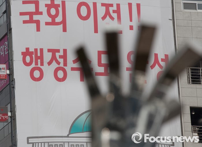 (세종=포커스뉴스) 29일 오전 세종시 국회의원 후보 선거사무소 외벽에 '국회이전, 행정수도 완성'이라는 공약이 적힌 현수막이 걸려있다.