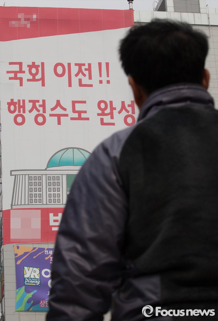 (세종=포커스뉴스) 29일 오전 세종시 국회의원 후보 선거사무소 외벽에 '국회이전, 행정수도 완성'이라는 공약이 적힌 현수막이 걸려있다.