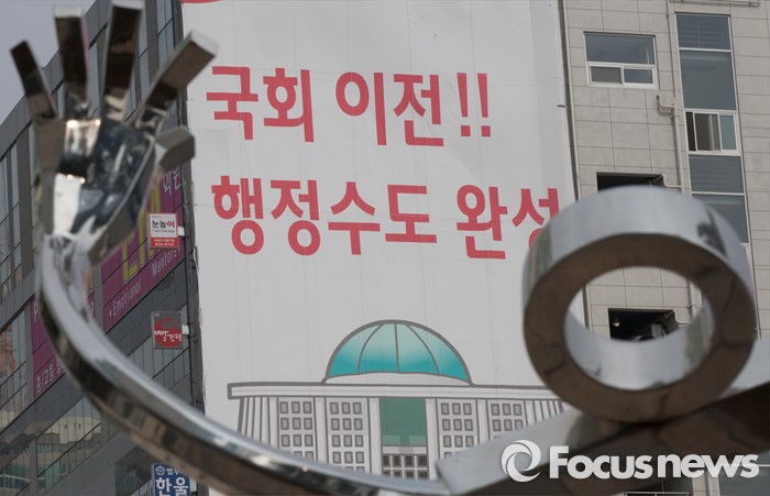(세종=포커스뉴스) 29일 오전 세종시 국회의원 후보 선거사무소 외벽에 '국회이전, 행정수도 완성'이라는 공약이 적힌 현수막이 걸려있다.