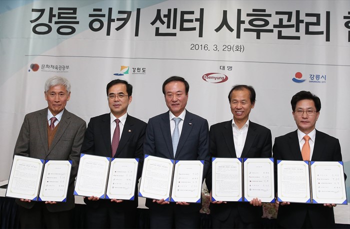 (고양=포커스뉴스) 김종 문화체육관광부2차관이 29일 경기 고양시 엠블호텔에서 열린 강릉 하키센터 사후관리 협약식에서 협약서를 들고 기념촬영 하고 있다. 왼쪽부터 김영진 대한아이스하키협회 부회장, 김종 2차관, 박흥석 대명그룹 총괄사장, 최문순 강원도지사, 최명희 강릉시장. <사진제공=문화체육관광부>