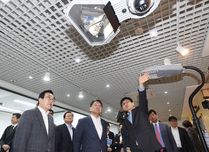 (부산=포커스뉴스) 유일호 부총리 겸 기획재정부 장관이 29일 규제프리존을 통한 지역전략산업육성을 위한 현장으로 부산시 소재 IoT 글로벌 스마트시티 실증지원센터를 방문, 스마트가로등, 안심태그 등 실증서비스에 관한 설명을 듣고 있다. <사진제공=기획재정부>