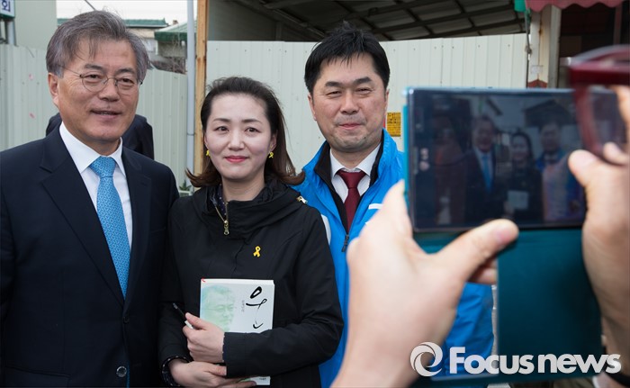 (논산=포커스뉴스) 문재인 더불어민주당 전 대표가 29일 오후 충남 논산시 중앙시장을 방문해 시민들과 기념촬영을 하고 있다.