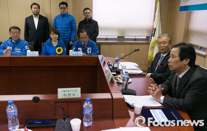 (서울=포커스뉴스) 김종인 더불어민주당 비대위 대표와 20대 총선 서울 강남구 후보들이 29일 오후 서울 강남구 전국개인택시회관에서 열린 전국개인택시연합회 정책간담회에 참석해 유병우 연합회장의 발언을 듣고 있다. 왼쪽부터 전원근 강남병, 전현희 강남을, 김성곤 강남갑 후보, 김 대표, 유 회장.