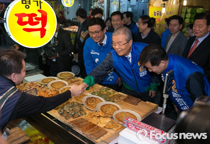(서울=포커스뉴스) 김종인(가운데) 더불어민주당 비대위 대표와 박성수(왼쪽) 송파갑, 최명길 송파을 후보가 29일 오후 서울 송파구 새마을시장을 방문해 상인들과 인사하며 지지를 호소하고 있다.