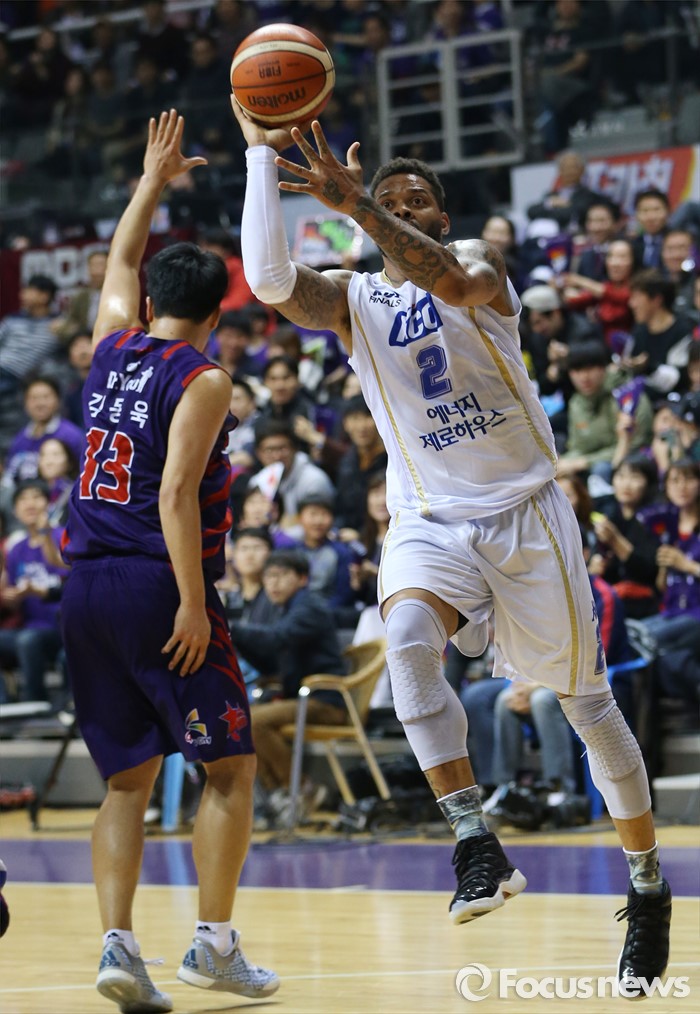(고양=포커스뉴스) 29일 고양체육관에서 열린 2015-2016 프로농구 챔피언결정전 6차전 오리온-KCC 경기에서 KCC 에밋이 오리온 김동욱의 수비를 피해 점프슛을 시도하고 있다.