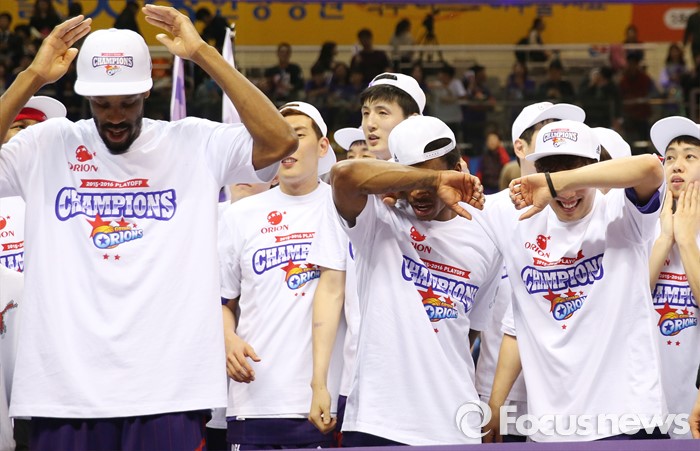 (고양=포커스뉴스) 29일 고양체육관에서 열린 2015-2016 프로농구 챔피언결정전 6차전에서 승리하며 4승 2패로 우승한 오리온 조 잭슨과 정재홍이 감격에 겨워 우는 시늉을 하고 있다.