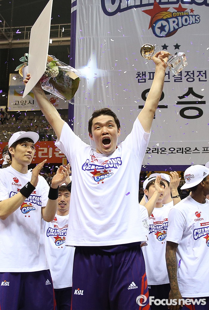 (고양=포커스뉴스) 29일 고양체육관에서 열린 2015-2016 프로농구 챔피언결정전 6차전에서 승리하며 4승 2패로 우승한 오리온 이승현이 MVP 수상을 하고 환호하고 있다.