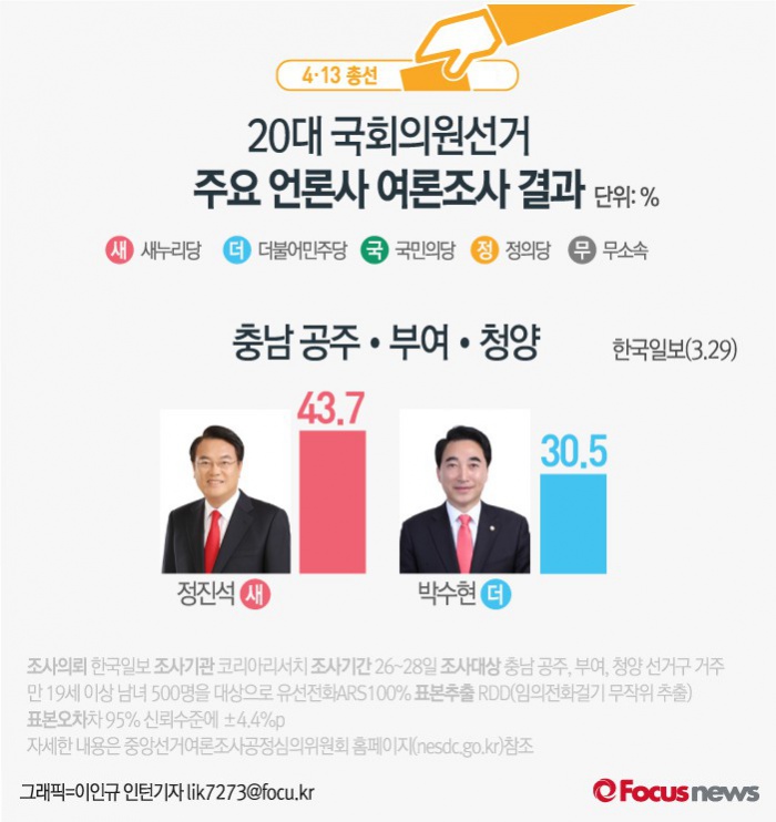 (서울=포커스뉴스) 한국일보가 코리아리서치에 의뢰해 조사한 결과에 따르면 30일 기준 정진석 새누리당 후보 지지율이 43.7%, 박수현 더불어민주당 후보 30.5%, 전홍기 국민의당 후보가 2.2%를 기록했다.
