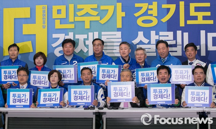 (수원=포커스뉴스) 30일 오전 수원 팔달구 경기도의회에서 열린 더불어민주당 경제살리기 경기 국회의원 후보자 연석회의에 참석한 김종인 비대위 대표, 이종걸 원내대표 등 지도부 및 후보들이 피켓을 들고 구호를 외치고 있다.