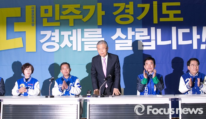 (수원=포커스뉴스) 30일 오전 수원 팔달구 경기도의회에서 열린 더불어민주당 경제살리기 경기 국회의원 후보자 연석회의에 참석한 김종인(가운데) 비대위 대표가 인사하고 있다.