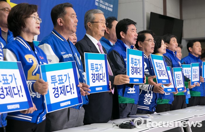 (수원=포커스뉴스) 30일 오전 수원 팔달구 경기도의회에서 열린 더불어민주당 경제살리기 경기 국회의원 후보자 연석회의에 참석한 김종인 비대위 대표, 이종걸 원내대표 등 지도부 및 후보들이 피켓을 들고 구호를 외치고 있다.