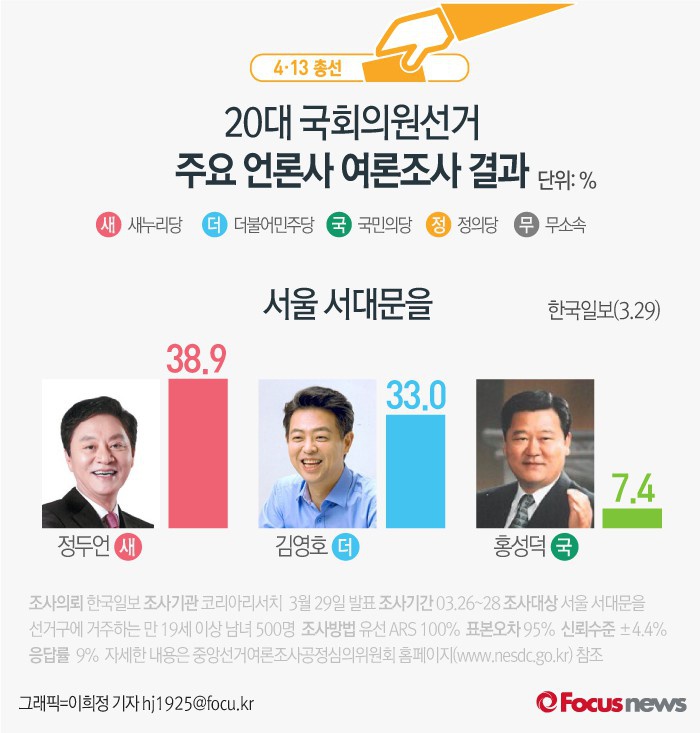 (서울=포커스뉴스) 한국일보가 코리아리서치센터에 의뢰해 이날 발표한 20대 총선 서울 서대문을 선거구 지역 여론조사에 따르면 새누리당 정두언 후보 38.9%, 더민주 김영호 후보 33.0%의 지지율을 보였다. 국민의당 홍성덕 후보는 7.4%의 지지율을 얻었다.