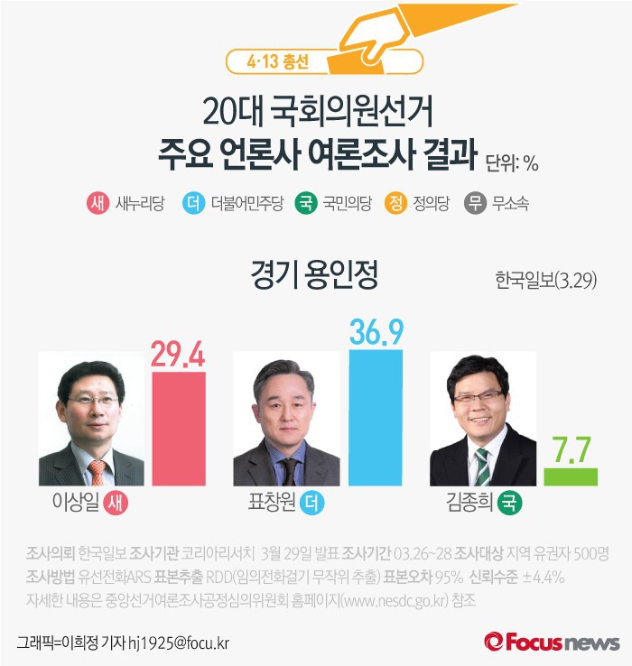 (서울=포커스뉴스) 한국일보가 코리아리서치센터에 의뢰해 30일 발표한 여론조사에 따르면 표창원 더불어 민주당 후보의 지지율이 36.9%, 현역 의원인 이상일 새누리당 후보가 29.4%를 기록, 오차범위 내 접전을 벌이고 있는 것으로 나타났다. 국민의당 김종희 후보 지지율은 7.7%다.