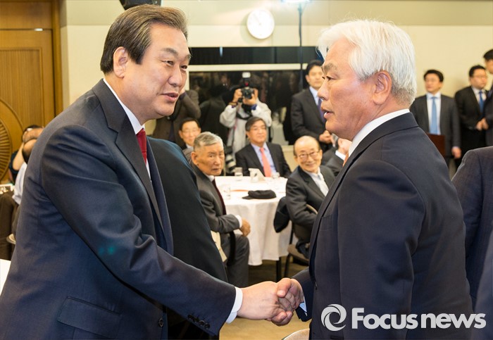 서울=포커스뉴스) 30일 오후 서울 중구 프레스센터에서 열린 관훈클럽 초청 관훈토론회에 참석한 김무성 새누리당 대표가 참석자들과 악수하고 있다.