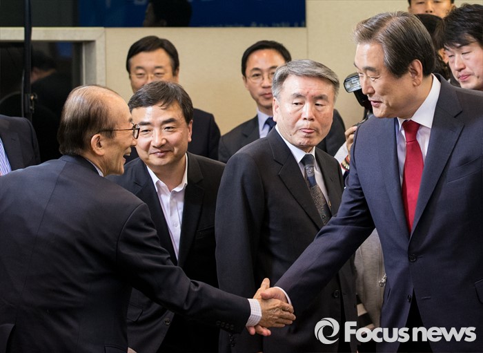 서울=포커스뉴스) 30일 오후 서울 중구 프레스센터에서 열린 관훈클럽 초청 관훈토론회에 참석한 김무성 새누리당 대표가 참석자들과 악수하고 있다.