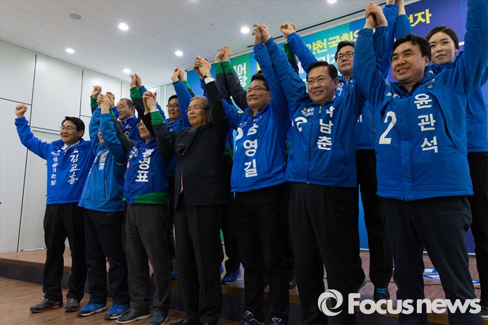 (인천=포커스뉴스) 김종인 더불어민주당 비대위 대표와 후보자들이 30일 오후 인천 남동구 정당선거사무소에서 열린 더불어민주당 경제살리기 인천 20대 총선 후보자 연석회의에 참석해 손을 들고 있다.