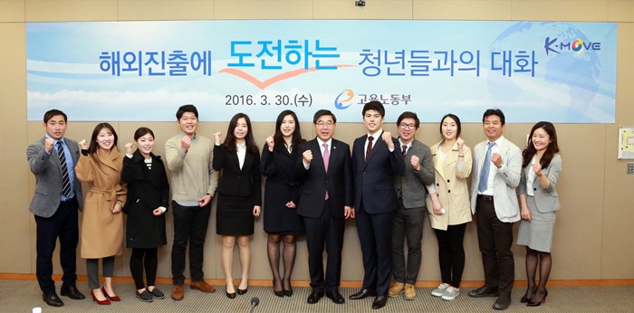 (서울=포커스뉴스) 이기권 고용노동부 장관이 30일 오전 서울 강남구 한국무역협회(51층 소회의실)에서 해외취업을 준비 중인 청년, 관련 대학 및 민간기관 관계자 들과 해외진출을 도전하는 청년들과의 대화를 갖고 파이팅을 하며 기념촬영 하고 있다. <사진제공=고용노동부>