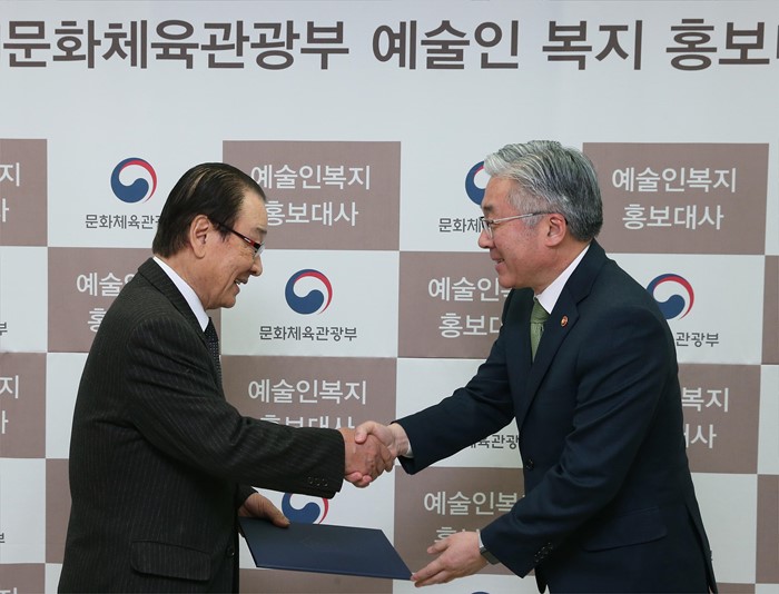 (서울=포커스뉴스) 김종덕 문화체육관광부장관이 30일 서울 용산구 국립극단 회의실에서 예술인 복지정책에 대한 예술인과 국민의 인지도를 개선하기 위해 예술인 이순재에게 예술인 복지 홍보대사 위촉장을 수여하고 있다. <사진제공=문화체육관광부>