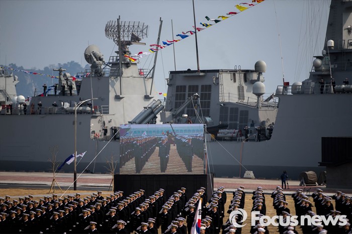 정부는 2010년 삼성물산 등과 계약을 맺고 공사에 착수했지만 환경파괴 등을 이유로 반대의견이 거셌고 논란 끝에 2012년에야 공사를 시작했다.(서귀포=포커스뉴스) 지난 2월 26일 오후 제주 서귀포 제주해군기지에서 열린 '제주민군복합형관광미항' 준공식에서 해군 장병들이 도열해있다. 성동훈 기자