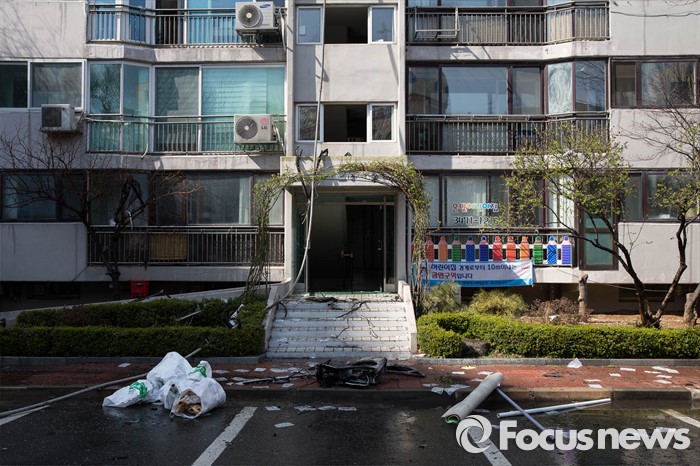 (서울=포커스뉴스) 30일 오후 2시께 서울 서초구의 한 아파트에서 원인모를 불이나 소방당국이 진화 작업에 나섰다. 아파트 주변에 잔재들이 흩어져 있다.
