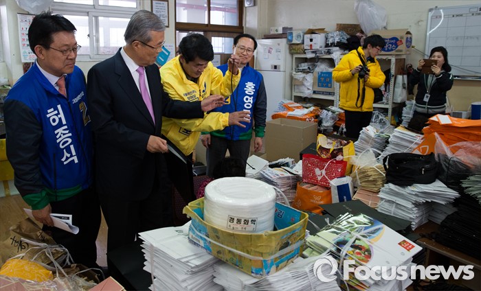 (서울=포커스뉴스) 김종인 더불어민주당 비대위 대표가 30일 오후 인천 남구 노인인력센터를 방문해 직접 종이봉투 끈을 묶고 있다. 왼쪽부터 허종식 인천 남구갑 후보, 김 대표, 김성진 정의당 인천 남구을 야권 단일후보, 홍영표 더민주 인천 부평을 후보.