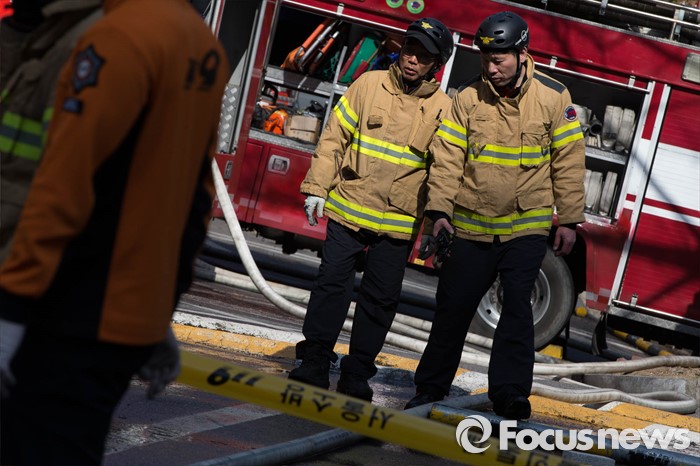 (서울=포커스뉴스) 30일 오후 2시께 서울 서초구의 한 아파트에서 원인모를 불이나 소방관들이 화재 진압에 대해 이야기 하고 있다.