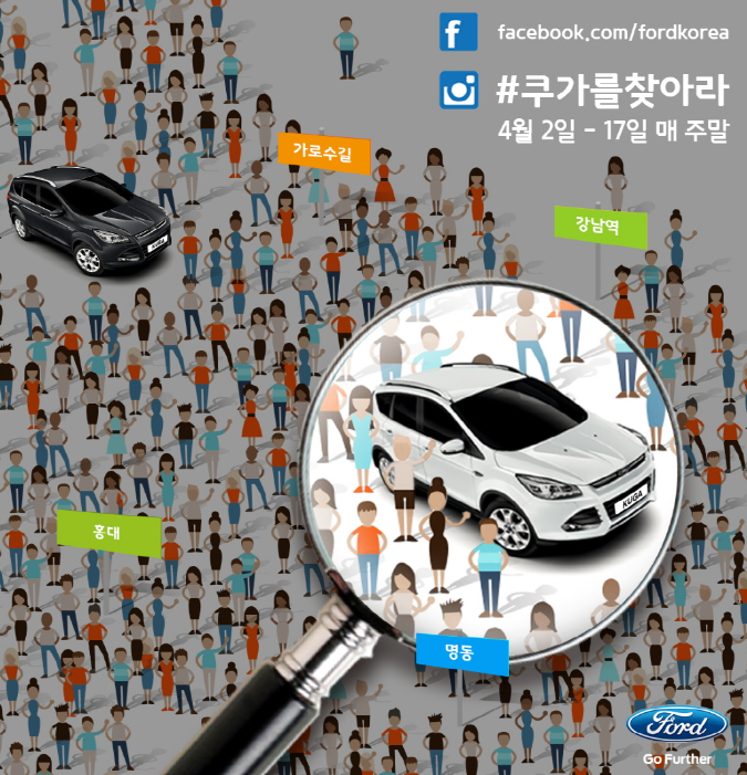 이벤트는 다음달 2일부터 17일까지 매 주말마다 진행되며 이벤트의 원활한 진행을 위해 포드는 ‘뉴 쿠가’를 홍대, 가로수길, 명동 등 서울 인기 지역에 돌아다니도록 할 계획이다.포드코리아의 '#쿠가를 찾아라' 이벤트 <사진제공=포드코리아>