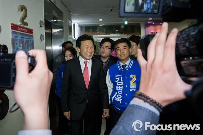 (성남=포커스뉴스) 손학규(왼쪽) 전 더불어민주당 상임고문이 30일 오후 경기도 성남시 김병욱 더민주당 분당을 후보 선거사무소을 방문하고 있다.