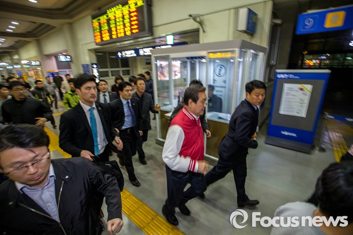 (대구=포커스뉴스) 김무성 새누리당 대표가 30일 오후 대구 수성구 새누리당 대구시당에서 열린 '선거대책위원회의'에 참석해 회의를 마친 뒤 수도권 선거운동을 하기 위해 서울로 향하는 기차로 이동하고 있다.