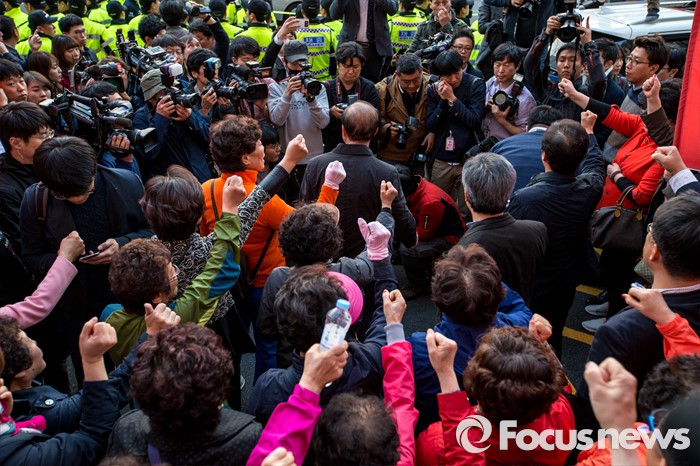 (대구=포커스뉴스) 30일 오후 대구 수성구 새누리당 대구시당 앞에서 이재만 새누리당 대구 동구을 예비후보 지지자들이 '선거대책위원회의'에 참석하기 위해 대구를 방문한 김무성 새누리당 대표에게 항의하기 위해 모여 있다.
