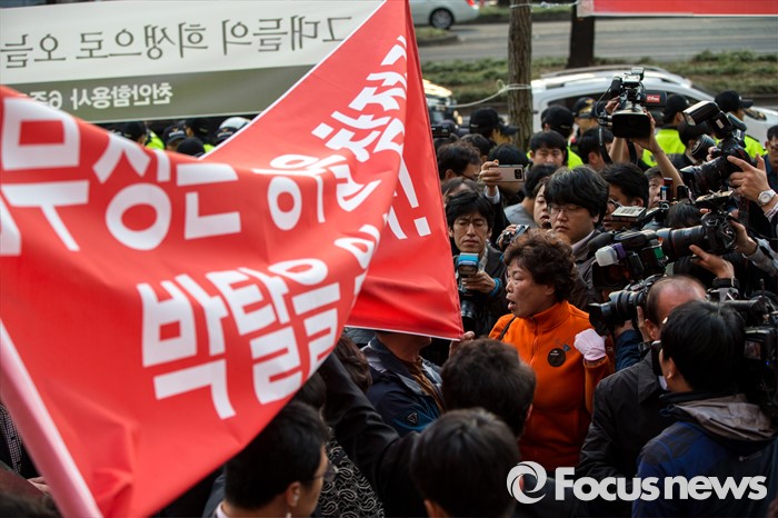 (대구=포커스뉴스) 30일 오후 대구 수성구 새누리당 대구시당 앞에서 이재만 새누리당 대구 동구을 예비후보 지지자들이 '선거대책위원회의'에 참석하기 위해 대구를 방문한 김무성 새누리당 대표에게 항의하기 위해 모여 있다.