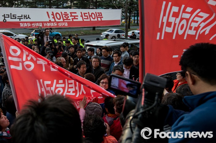 (대구=포커스뉴스) 30일 오후 대구 수성구 새누리당 대구시당 앞에서 이재만 새누리당 대구 동구을 예비후보 지지자들이 '선거대책위원회의'에 참석하기 위해 대구를 방문한 김무성 새누리당 대표에게 항의하기 위해 모여 있다.